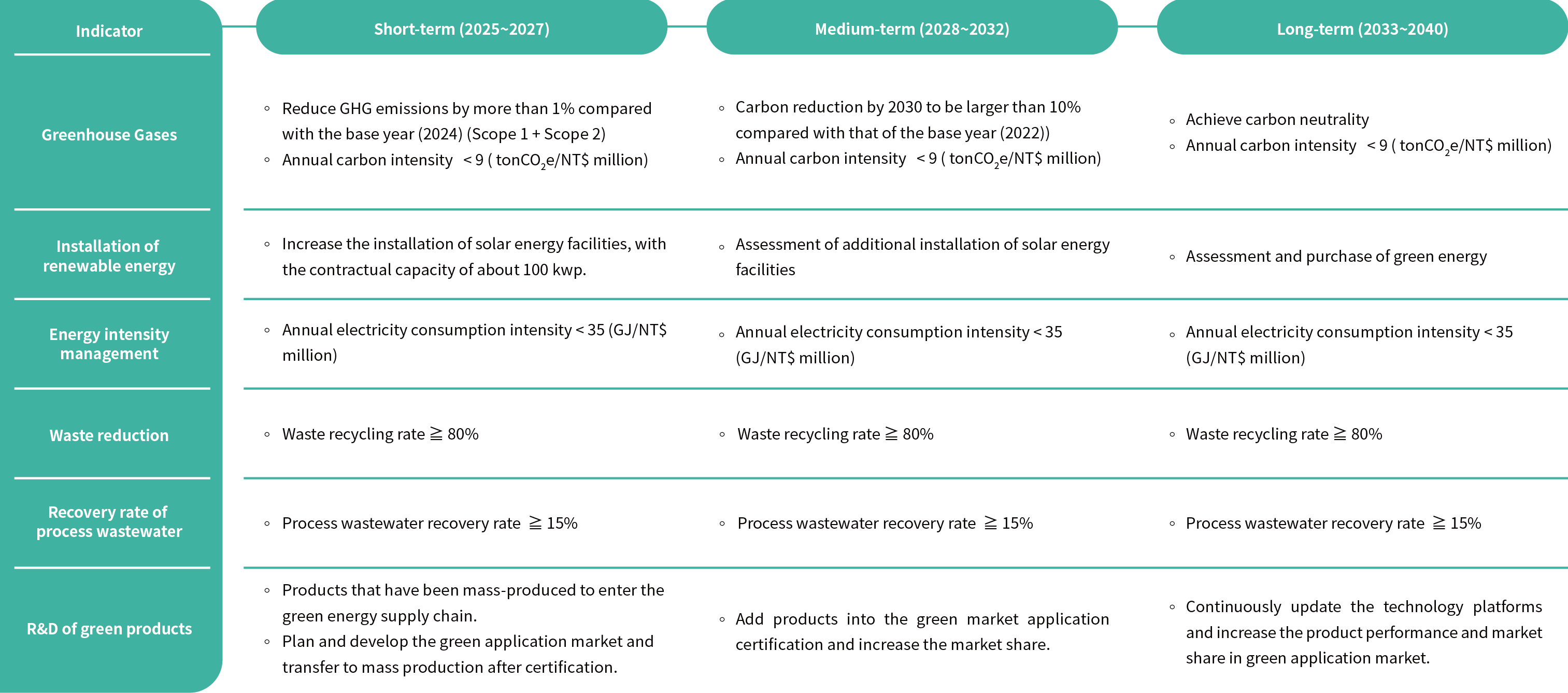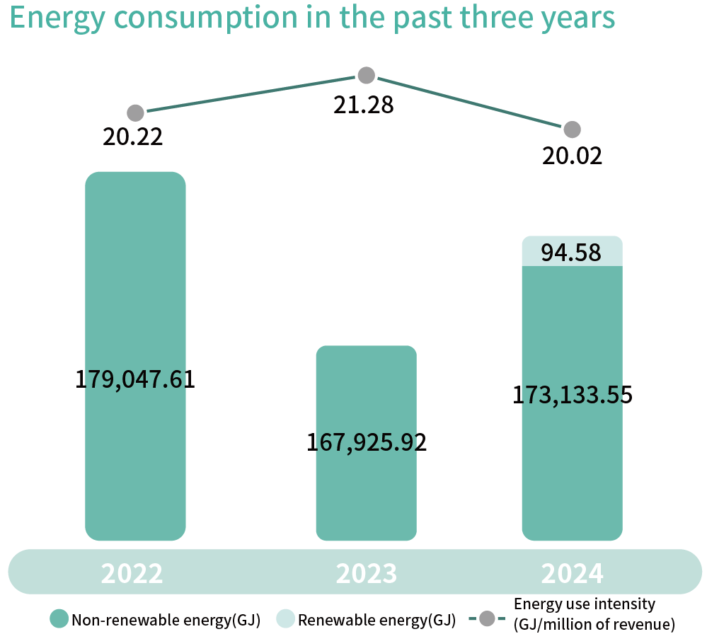 In addition, the Company installed solar panels in the plant. In 2024, the solar installation capacity reached 183.89kW in 2024, generating a total of 181,876.55 kWh (about 654.75 GJ) of electricity, and 154.63 kW of capacity was sold in bulk to Taiwan Power Company. The 29.26 kW capacity is for self-consumption, with a total generation of 26,272.55kWh (about 94.58GJ). In the future, the Company will continue to raise the proportion of renewable energy use to achieve effective reduction of carbon emissions.