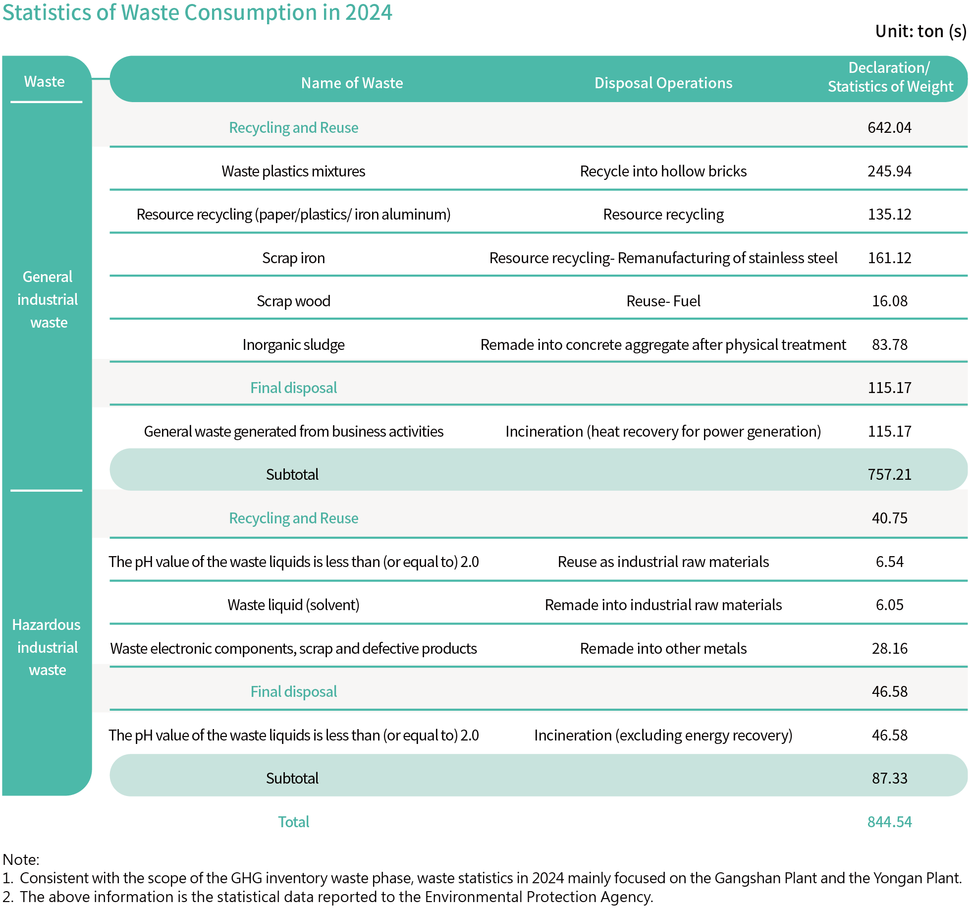 The total waste generated in Gangshan Factory and Yongan Factory totaled 844.54 metric tons in 2024, of which 757.21 metric tons (89.66%) were general industrial waste and 87.33 metric tons (10.34%) were hazardous industrial waste. To improve resource utilization efficiency and reduce environmental impact, the Company recycled and reused a total of 682.79 metric tons of waste in 2024, accounting for approximately 80.85% of the total waste; of which a total of 40.75 metric tons of hazardous waste was recycled and reused, accounting for about 46.66% of the total hazardous waste.