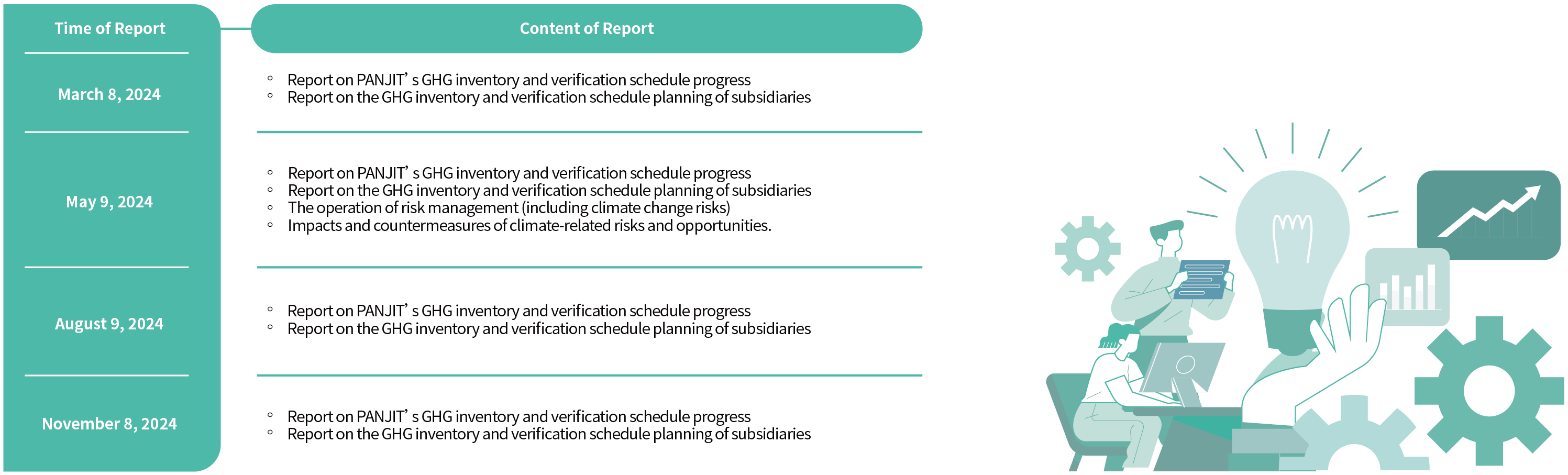 PANJIT’s ESG Promotion Office reports to the board of directors on the schedules and progress of the GHG inventory and verification schedule progress on a quarterly basis. The content of the 2023 climate-related report covers the GHG inventory progress and planning, the risk management operations (including climate change risks), etc. Through the operation of ESG Promotion Office and the reports and discussions on related climate