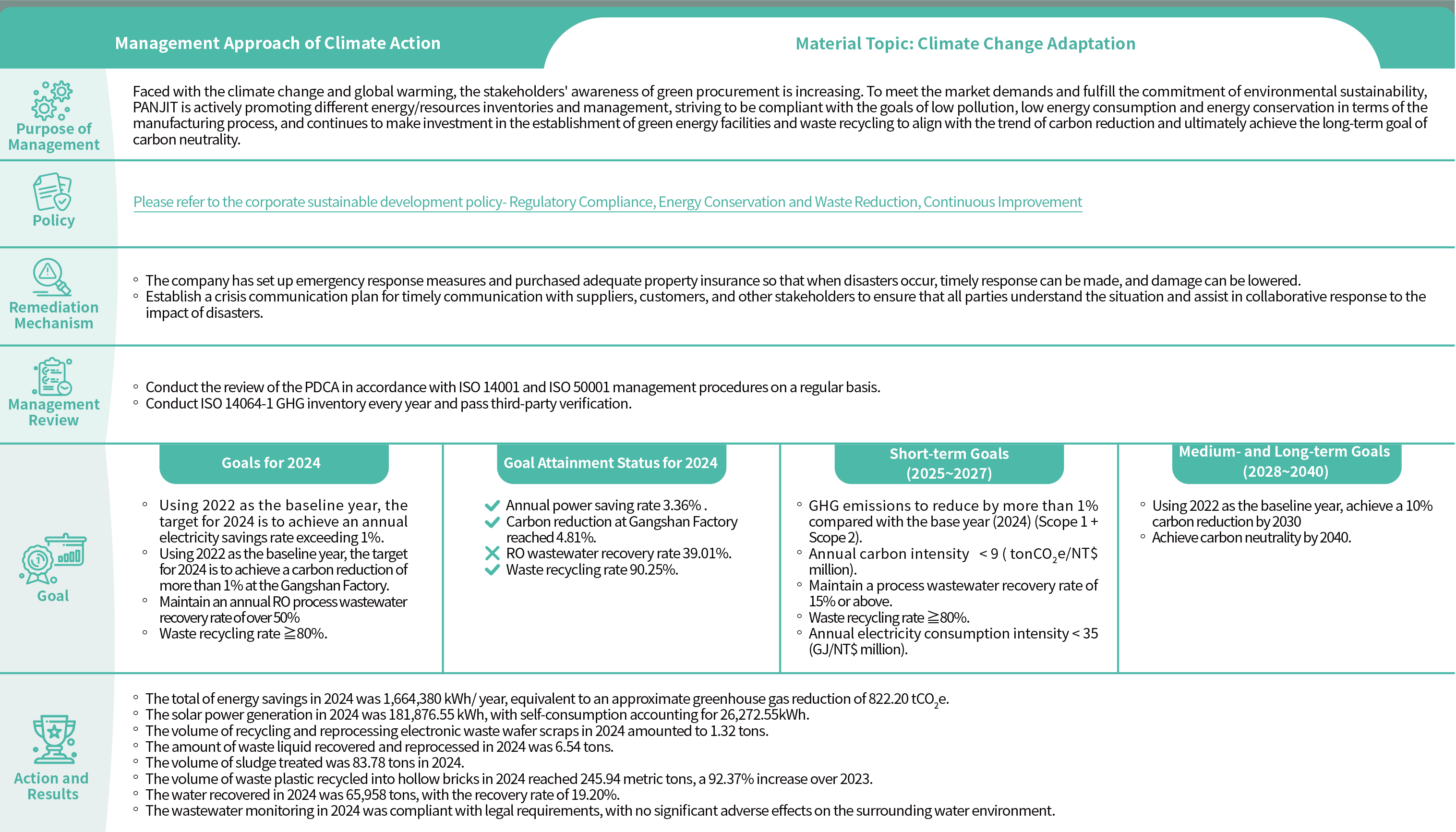 In the face of an increasingly severe business environment, companies cannot ignore the regulatory requirements and the climate actions brought about by global warming. PANJIT has paid long-term attention to climate change, and is dedicated to the promotion of sustainable governance. To respond to the Financial Supervisory Commission’s "Sustainable Development Roadmap" and the National Development Council’s “Taiwan’s Pathway to Net-Zero Emissions in 2050”, PANJIT refers to the Task Force on Climate-related Financial Disclosures (TCFD) Framework and the recommendations from Taiwan Stock Exchange Corporation Rules Governing the Preparation and Filing of Sustainability Reports by TWSE Listed Companies to assess and identify climate change risks and opportunities.